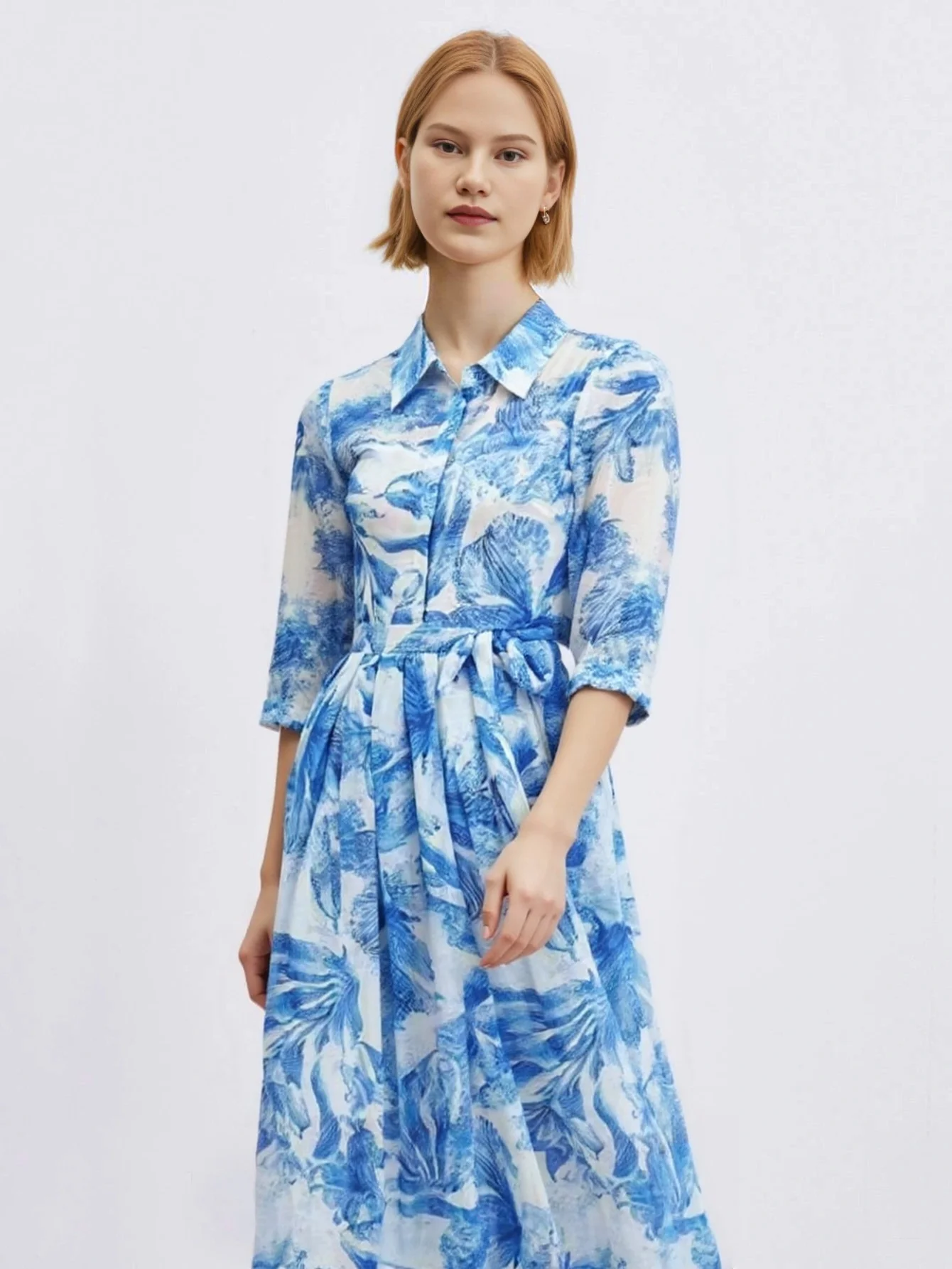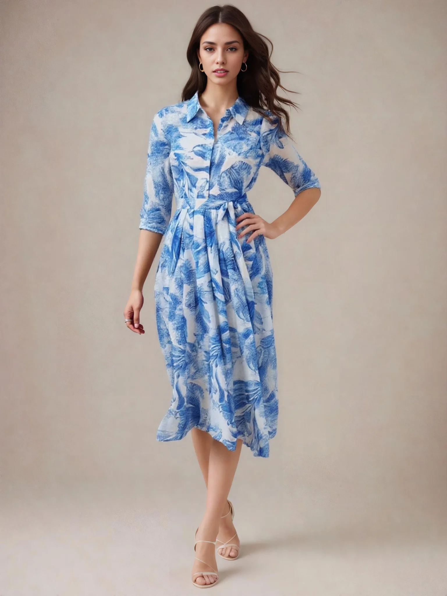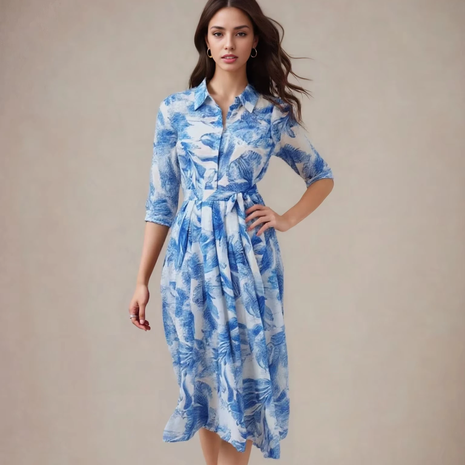 2025 Style Best-selling Blue Printed Half-Sleeve Collar Buttoned Women’s Dress
