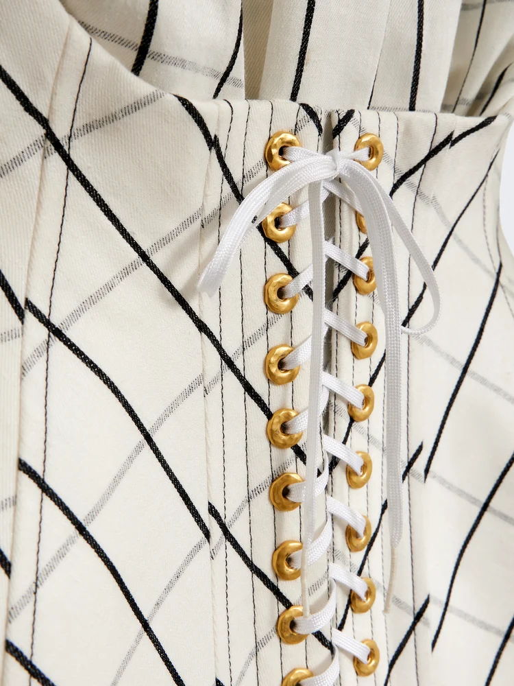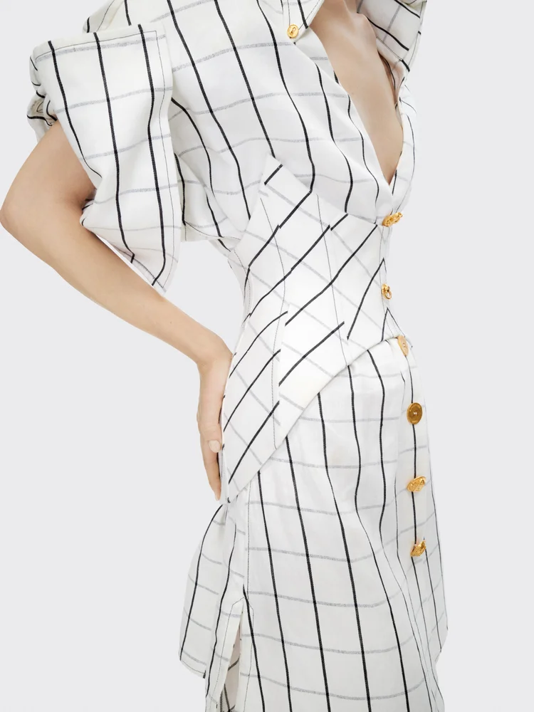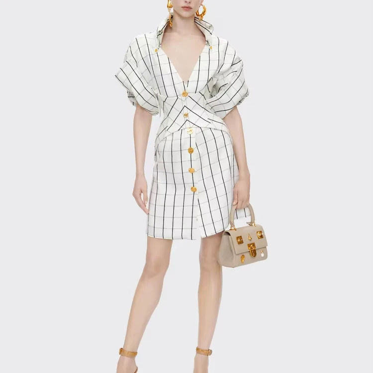 2025 Summer Casual Midi Dress Collection for Women 100% Cotton White Black Striped Print XS Size Elastic Waist Button Washable