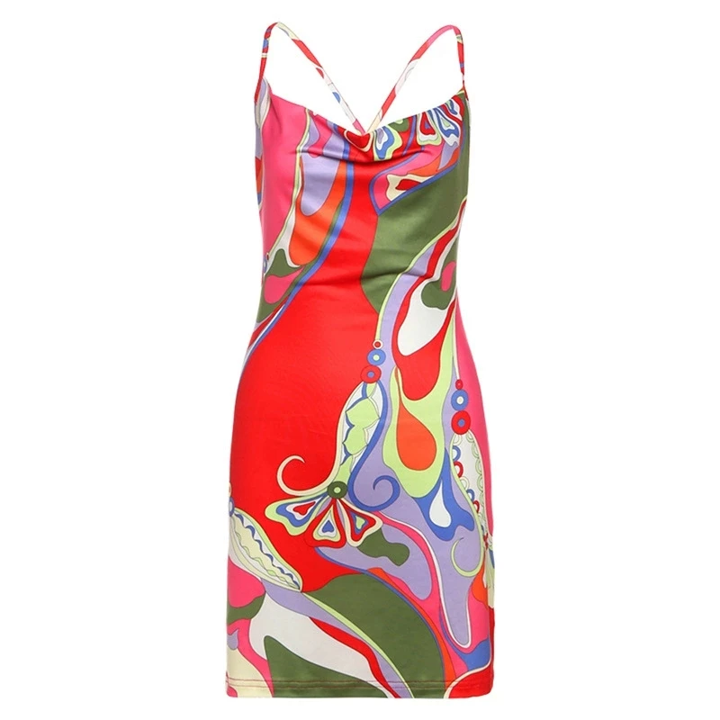 2025 Summer New Women’s Fashion and Sexy High Waist Slim Fit Bag Hip Printed Strap Dress
